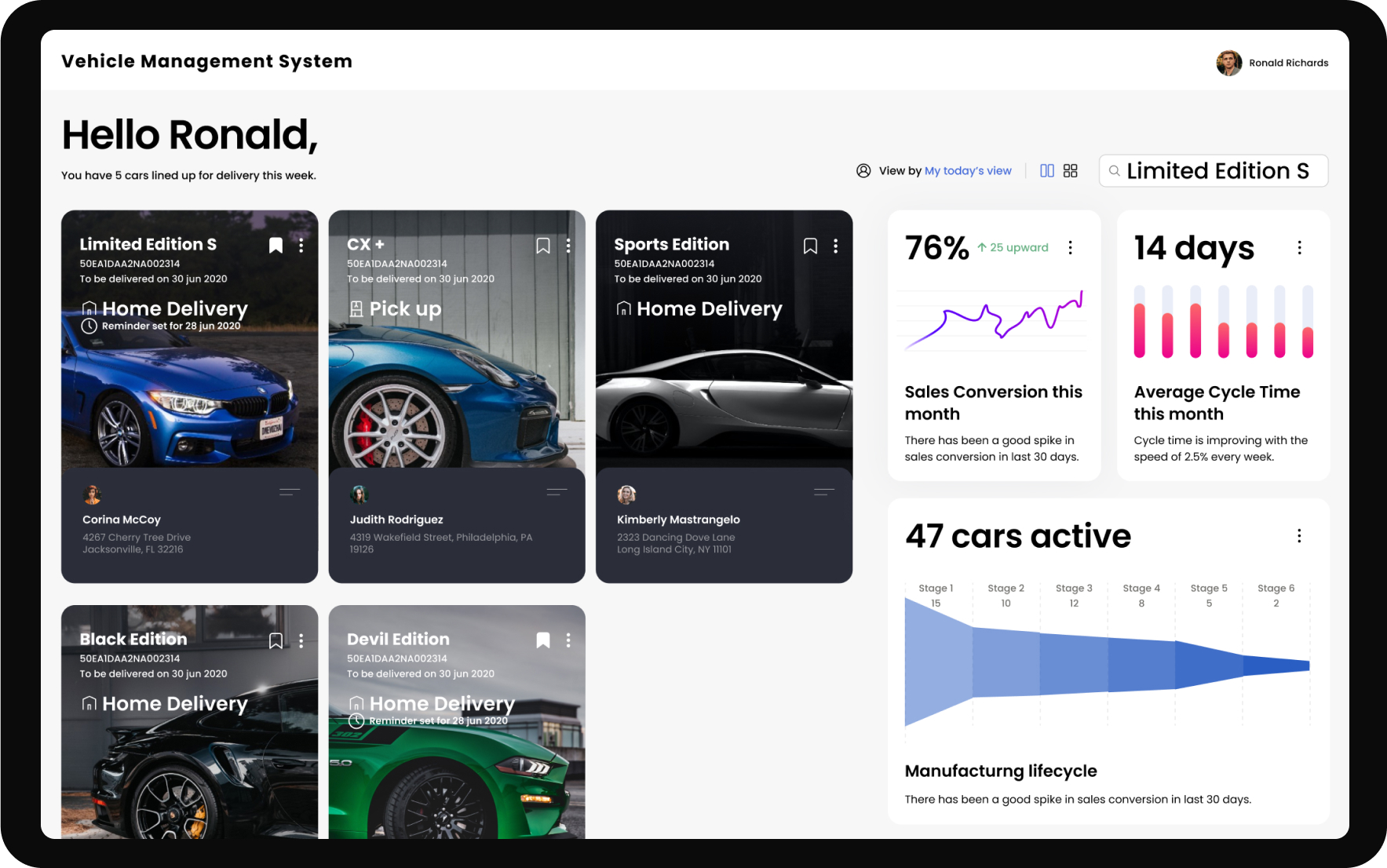 I work on this Vehicle Management Project as a UI/UX designer and have design the whole thing from scratch to final. This VMS system have multiple dashboards for various things such as Inventory Management, Manufacturing and Production Life cycles , Sales Analytics, Reporting and Analytics, Cost Analytics, Vehicle Information Management, Notification and Alert system, Delivery management dashboard, Multilingual Support more.